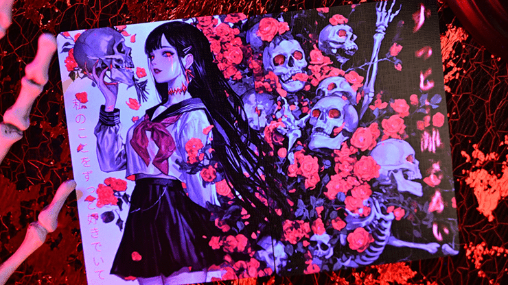 Dans la culture cinématographique et télévisuelle japonaise, l’anime et le film d’horreur japonais sont, selon nous, deux genres emblématiques. Pour cette œuvre, nous avons combiné ces deux univers et, de surcroît, intégré une technique unique de changement de couleur dans l’impression des cartes afin de vous offrir une pièce unique :