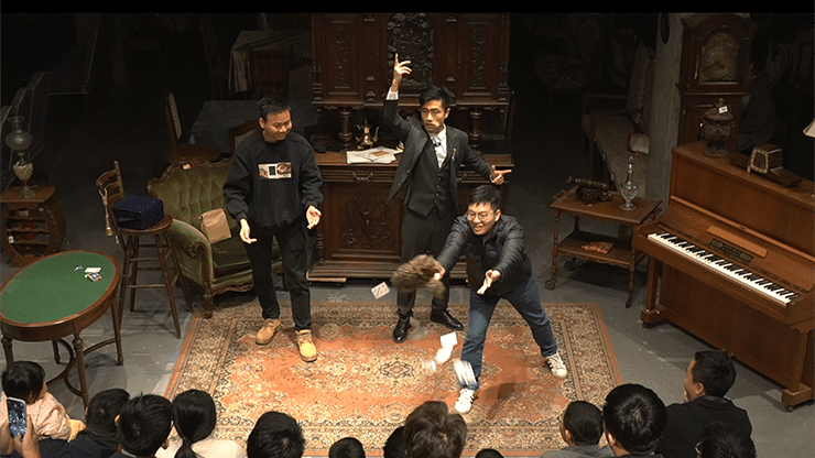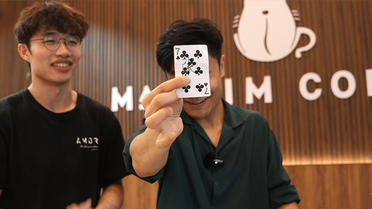 Le magicien invite deux spectateurs sur scène : l’un choisit et signe une carte, tandis que l’autre s’occupe de Papi, le raton laveur. Lorsque la carte signée est lancée en l’air, Papi saute héroïquement… pour retomber lamentablement sur le dos. Le magicien soupire : « Il est trop gourmand, il a mangé la carte. »
